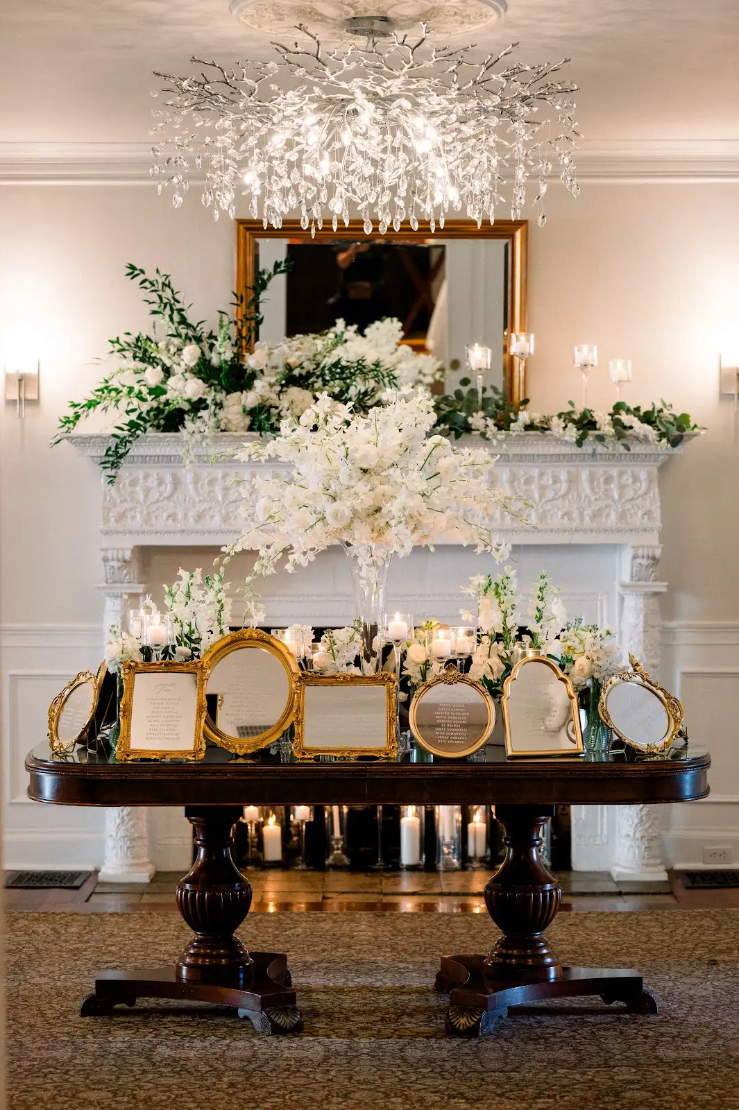 Candles played a starring role in the ambiance, with floating flames in our rentable tall-stemmed Monet Candle Holders paired with votives that cast a soft glow across the tables as daylight faded. The sweetheart table featured a stunning floral waterfall, creating a romantic focal point. One of our favorite elements was the welcome table and mantle area, always known for greeting guests with a “wow.” The Citrano family had a clear vision centered around gold-mirrored frames as an alternative to a traditional seating chart. Combined with a sprawling display of florals and lighting, this installation has become a viral inspiration for so many future brides.